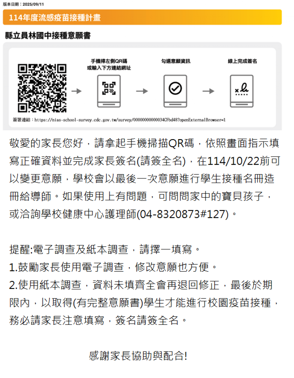 提醒家長:本意願調查,不論同意或不同意,都需要調查 (電子或紙本,擇一),為減少校園流感疫苗接種調查時意願填寫不全、遺失或變更不便等流程,學校鼓勵家長採電子意願調查,謝謝家長配合。