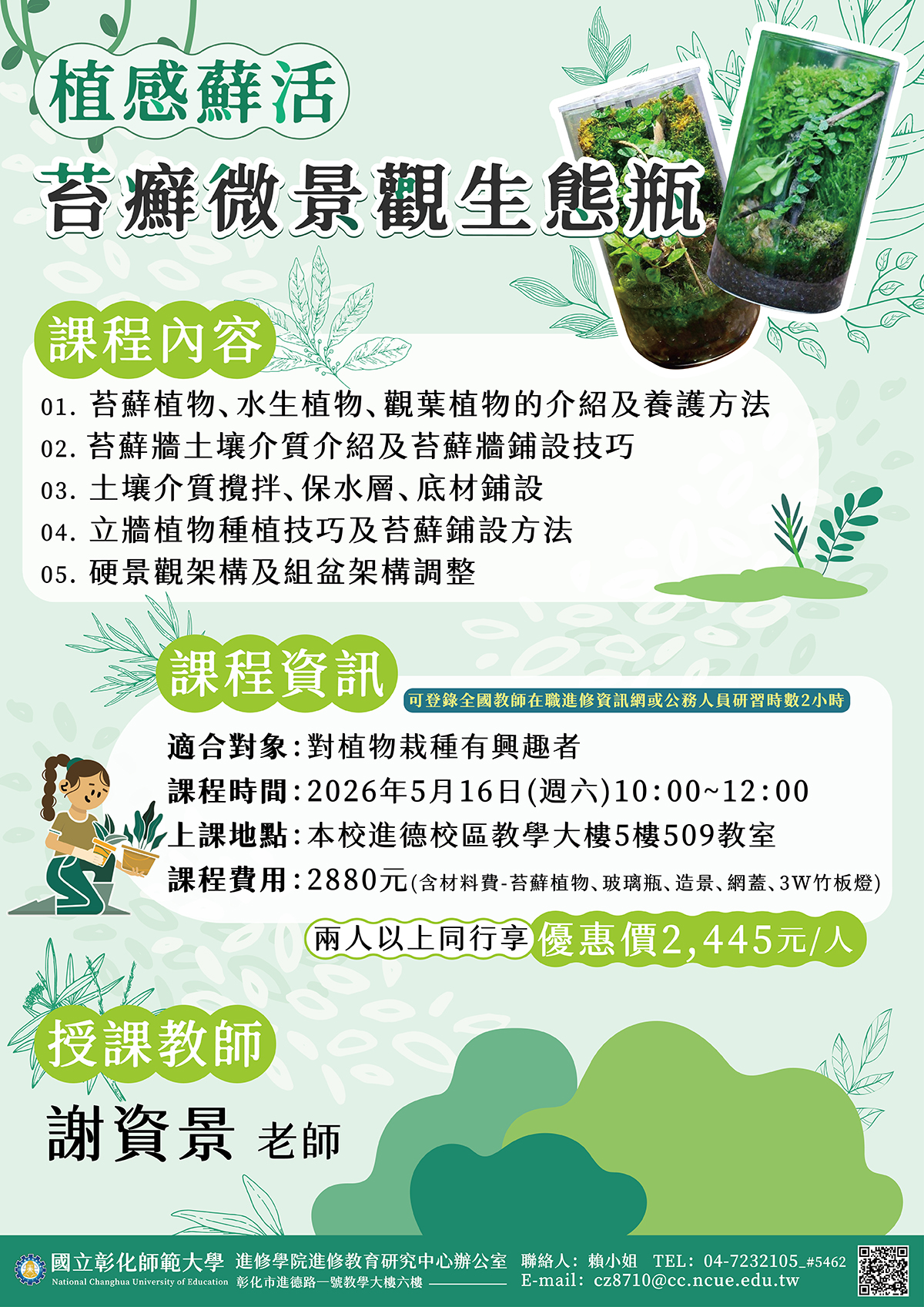 轉知:國立彰化師範大學進修學院推廣教育課程「【AI賦能.跨域應用】創意行銷與多媒體視覺創作」、「【植感蘚活】苔蘚微景觀生態瓶」課程簡章。