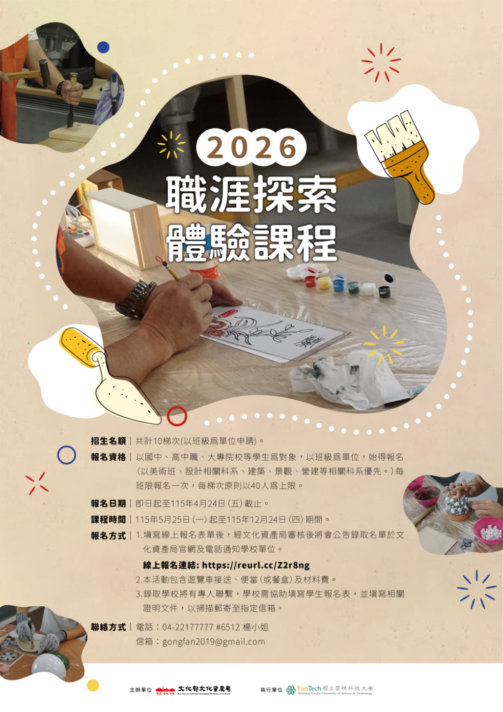 (二)課程內容:主題包含彩繪作、泥塑作、土水作、瓦作及木作等職涯探索與實作體驗課程。